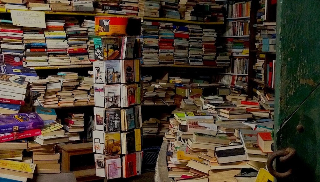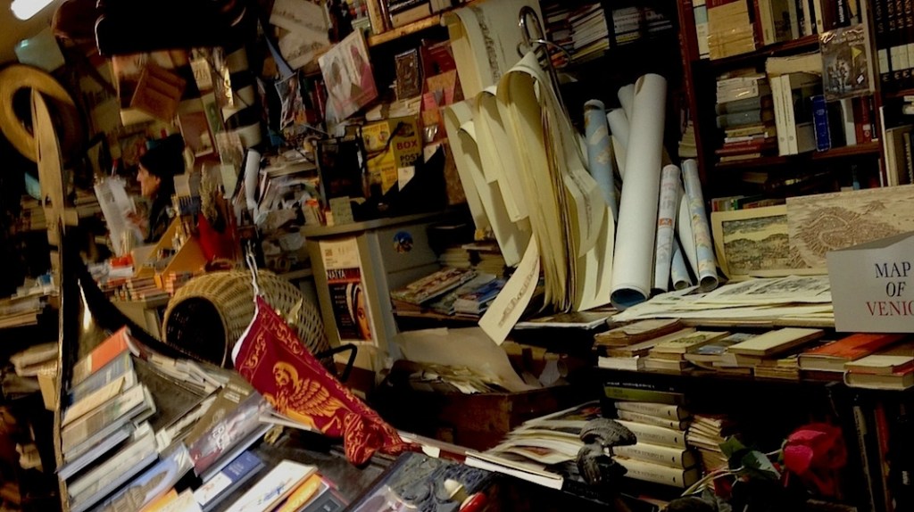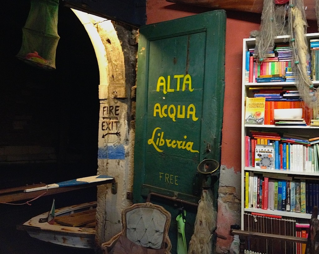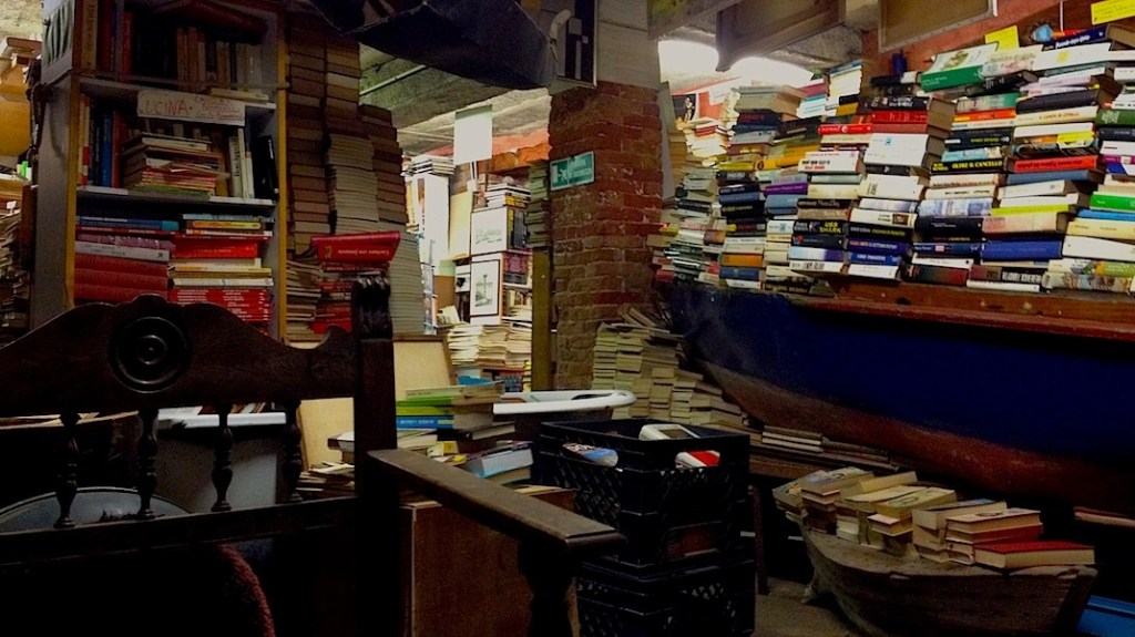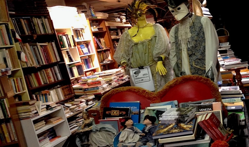 Den mest spektakulära bokhandel jag har sett; hittade den när jag var i Venedig i januari. Den är charmig, rörig, labyrintisk, fuktig (som så mycket i Venedig), välkomnande och välförsedd med veneziana; inrymd i ett gammalt hus mellan en smal gränd och en kanal med ingång från båda håll. Ägaren har garderat sig mot högvatten (acqua alta) genom att packa en massa böcker i båtar.