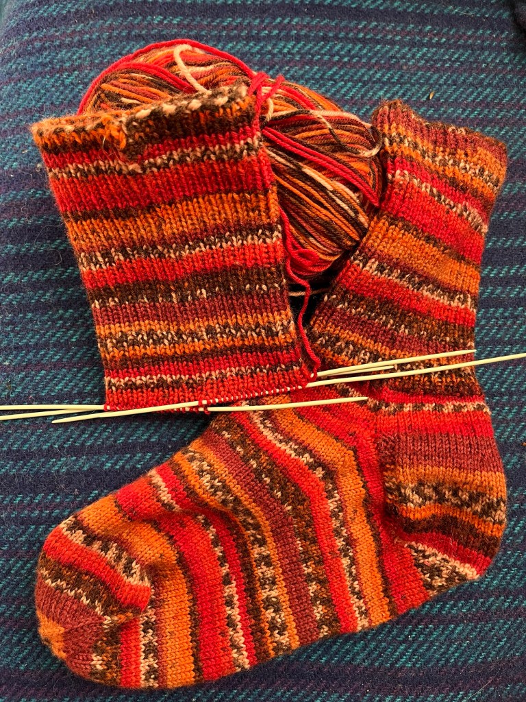 Gör hoptagning i slutet på sticka 2, sticka 2 m tills rätt. Fortsätt varannat varv till 20 m återstår på varje sticka. – Ovansidan av sockan ”äter upp” maskor från undersidan på båda sidorna.